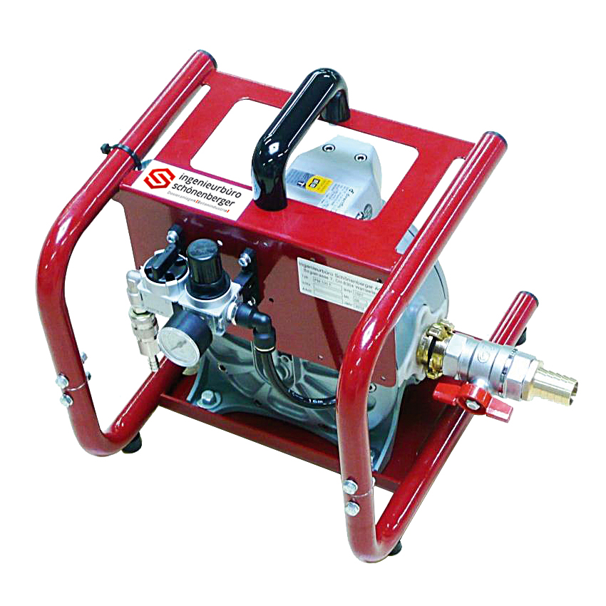 Tragbare, rein pneumatisch betriebene Membranpumpe für alle wässerigen Flüssigkeiten, trocken selbstansaugend bis max. 4 m, Förderhöhe max. 60 m, Förderleistung max. 100 L/min.